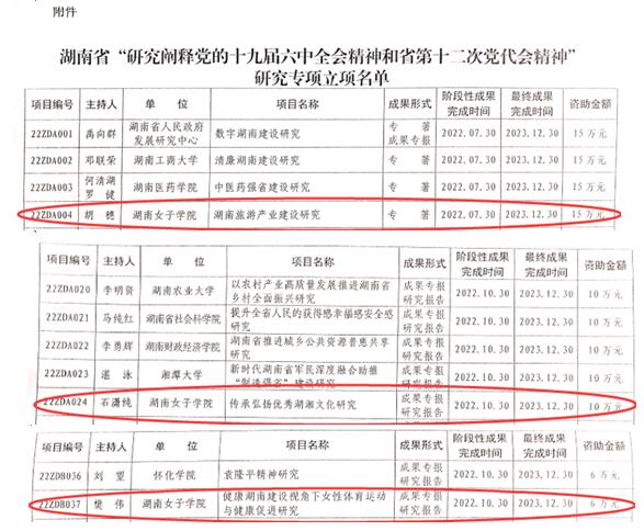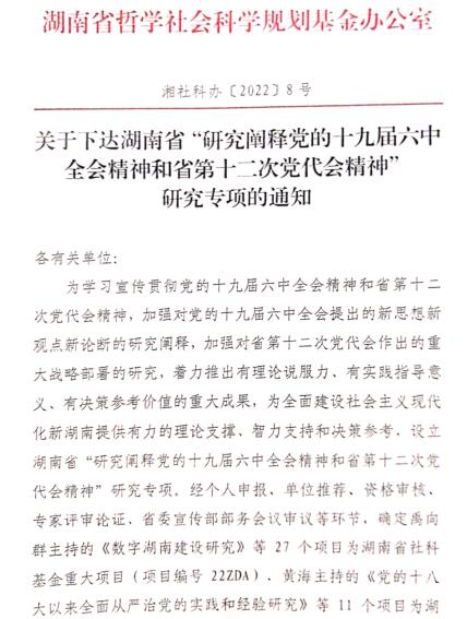 本网讯(科研处 顾娟)近日,湖南省哲学社会科学规划基金办公室下达了我省“研究阐释党的十九届六中全会精神和省第十二次党代会精神”研究专项的立项通知,金年会app获得2项省社科基金重大项目和1项重点项目,这是金年会app首次立项3项省级重大和重点项目,立项数在全省高校中位列第2名。