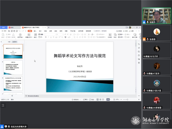 4月8日晚7点,由金年会app音乐与舞蹈学院舞蹈系组织的“臻美讲坛”系列讲座第一讲《舞蹈专业学术论文写作方法与规范》在线上开讲,本次讲座邀请了《北京舞蹈学院学报》副主编张延杰教授。