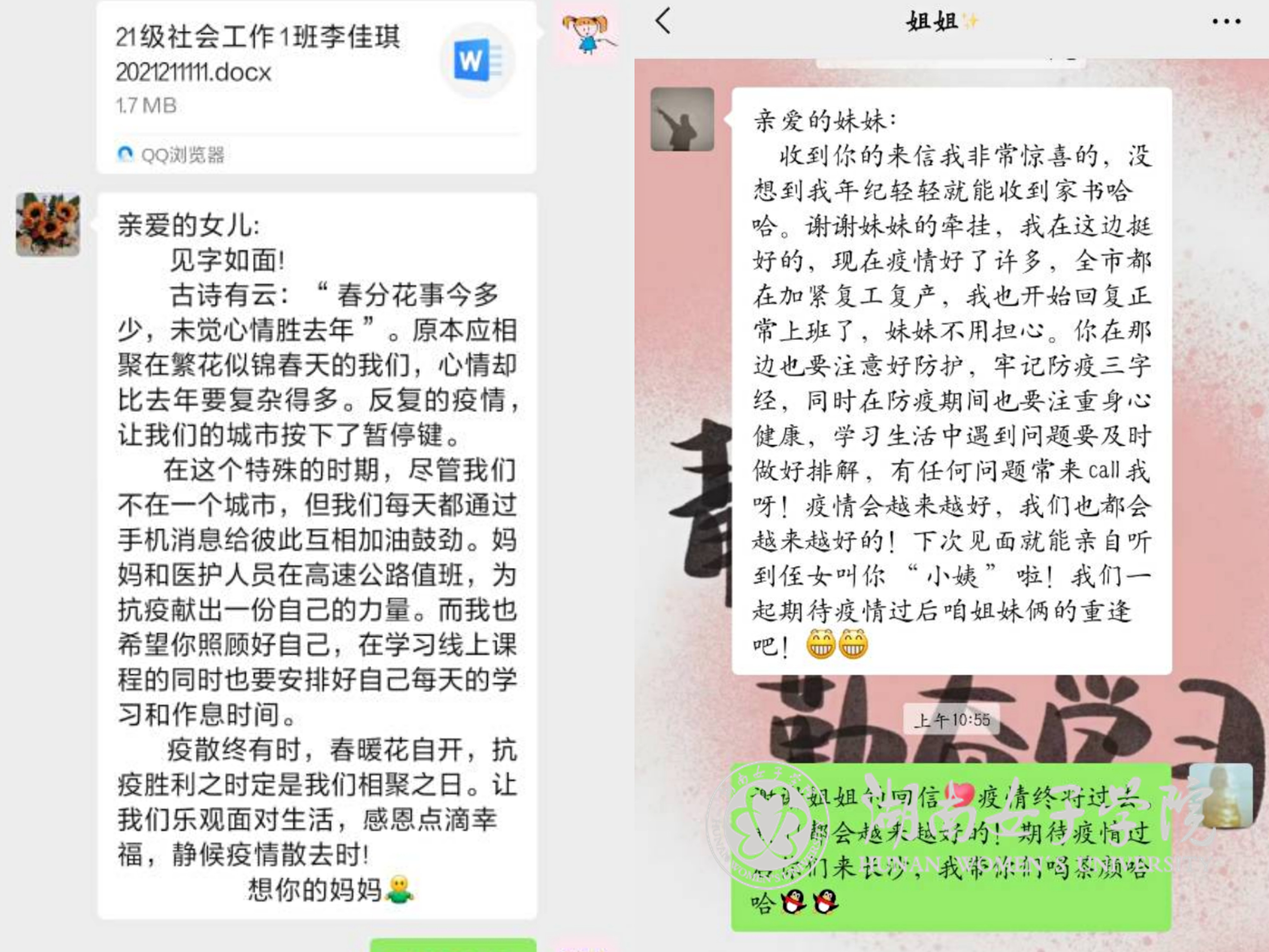 一封家书,一份期望,字字句句都充满了学生对远方家人的惦念和牵挂,饱含着坚定信心、众志成城共抗新冠疫情的决心。2021级社会工作专业学生李佳琪在给母亲的家书中写到,“在国家的规范管控下,我想无论是在学校上网课的我还是坚守在工作岗位上的您,亦或是因疫情而暂时封锁的大城小县,都一定能感受到在我们国家这种用小我成就大我,用小家组成大家的同舟共济、共克时艰的力量。”2021级女性学专业学生申巧怡在家书中写到,“您在家乡站好抗疫的基层岗,迎疫前行,我在学校当志愿者,书写抗疫的青春答卷。”家校心连心,隔空不隔爱,我院学子和家长坚守不同阵地,却有着同样坚定的大爱和勇气。