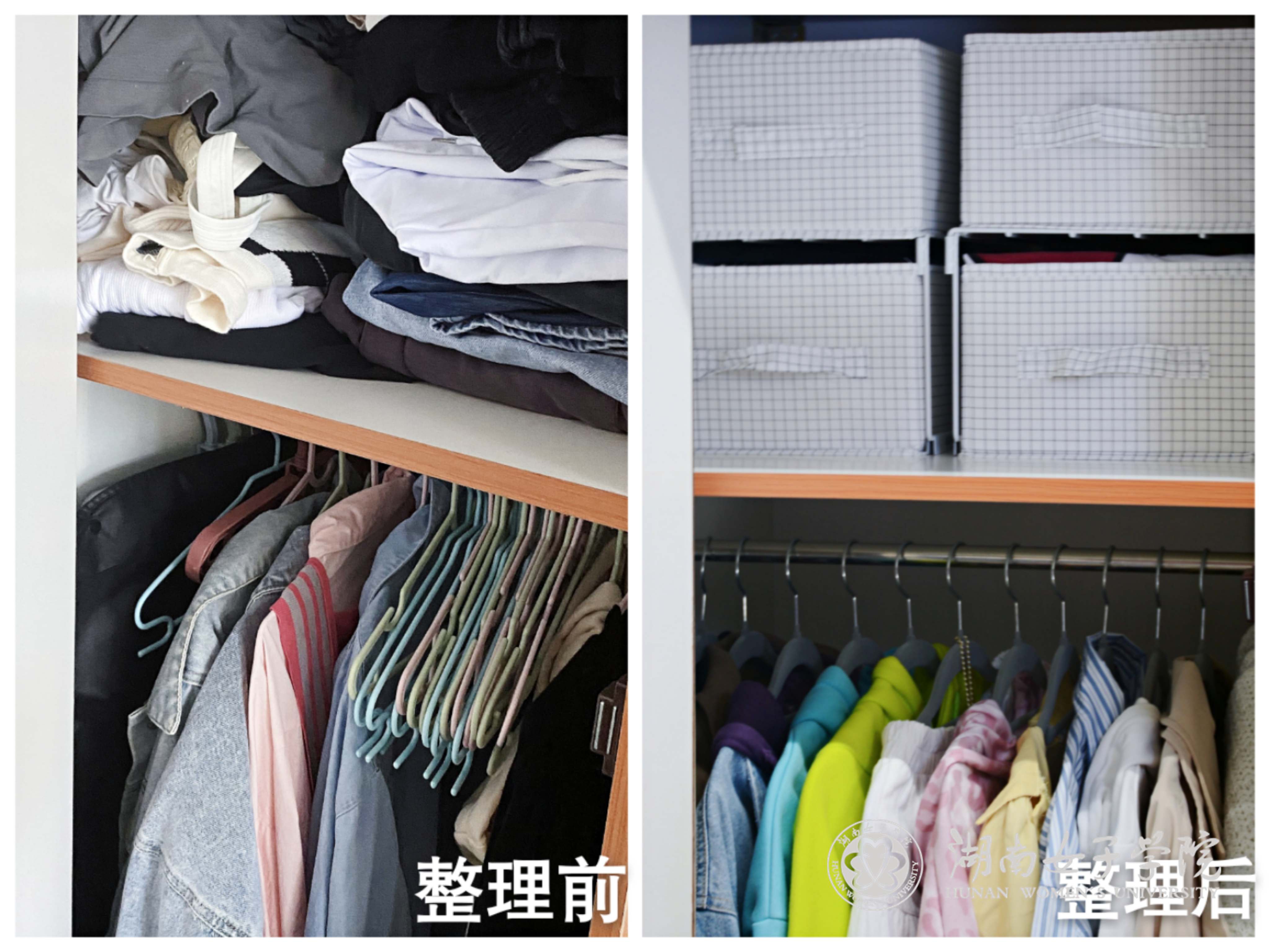 此次活动主要有三项内容:推送收纳技巧教学视频、收纳好物推荐、整理成果展示。同学们在每日收纳小技巧中,跟随视频学习衣物悬挂与折叠方法;好物推荐中,学姐的宝藏收纳神器被大家纷纷“种草”;整理收纳实践部分,同学们尝试去繁就简、断舍离、灵活运用空间进行整理。活动中,同学们积极响应,群策群力,在不断学习和尝试下,提出了许多新颖独特的小技巧,在有限的空间里合理布局,在舍友间奇思妙想的碰撞中,寝室变得井井有条,生活质量得到了显著提高。