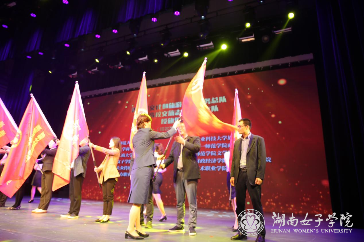 本网讯(社会发展与管理学院 屈格 姜阳睿)在第12个“中国旅游日”来临之际,5月12日,湖南省文化和旅游志愿服务工作总结表彰大会暨高校文旅志愿服务队授旗在湖南省文化馆举行,社会发展与管理学院副院长李先跃从李爱武手中接过队旗,标志着金年会app文旅志愿服务正式起航。湖南省委宣传部副部长、省文旅厅党组书记、厅长李爱武以及省文旅厅副厅长尚斌出席会议。