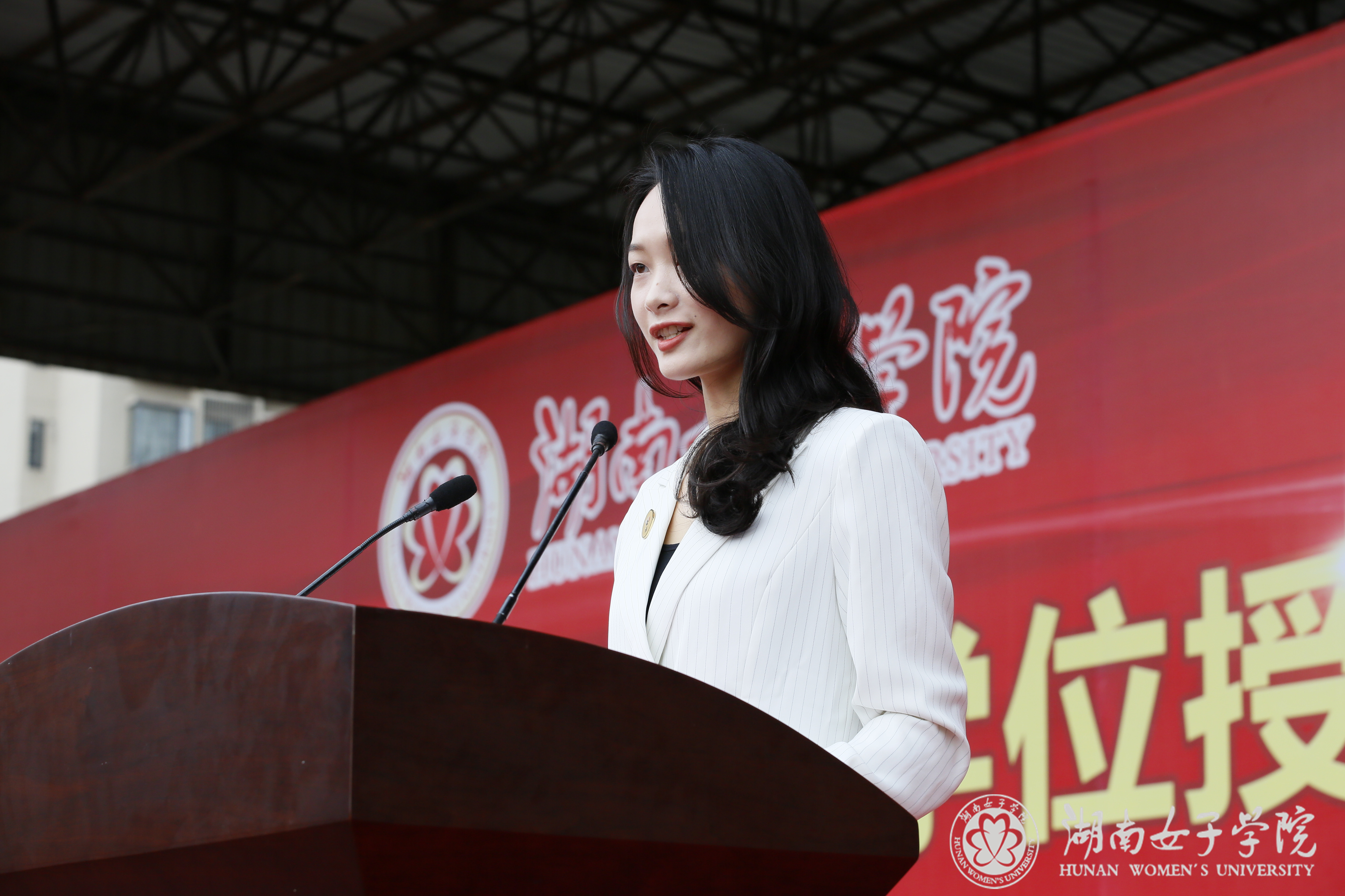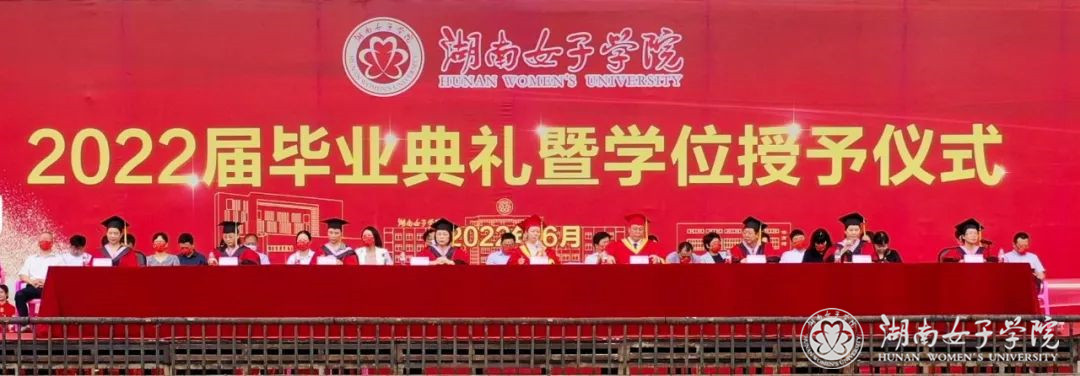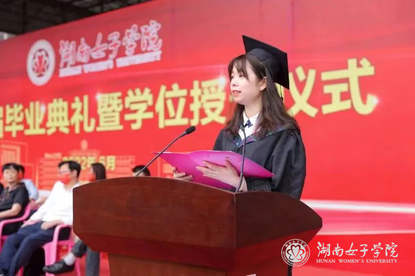 毕业典礼在庄严肃穆的国歌声中拉开序幕。石潇纯宣读关于授予毕业证书、学士学位证书的决定。贺江平宣读关于表彰优秀毕业生的决定。杨兰英、胡穗等校领导为优秀毕业生颁发获奖证书。2022届优秀毕业生社会发展与管理学院学前教育专业禹佳懿作为代表发言,她表示,2022届毕业生一定会铭记“懿德睿智 笃行臻美”的校训,在各自领域勇攀高峰,尽展新时代青年的使命与担当,身为金年会app人而备感骄傲。湖南云想家庭服务有限公司法人代表兼总经理黄文静作为校友代表发言,感谢学校为学生成长与发展提供的坚实基础,她用自己的亲身经历告诉学妹们“创业虽苦、坚持很酷”。文学院辅导员谢妙昱带领播音与主持专业学生崔志宇、董佳源、牛梦瑶代表在校师生为毕业生送上真挚祝福。