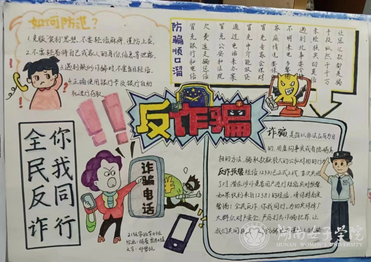 “执笔发声 你我同心”是防电信诈骗手抄报征集活动的主题,该活动面向全院学生,征集了数十幅优秀作品。其中2020级家政学专业学生郑惠敏从“电信诈骗含义”、“常见骗局手段”、“反诈知识口诀”三个方面深入浅出地总结出防诈骗的技巧与方法,提出“手段纵然千千万,让你汇款就是骗”的反诈口号,用生动活泼的手抄报形式提醒学生在碰见诈骗时不要被假象迷惑,不贪图小便宜,做到“不轻信、不泄密、不汇款、不刷单”,增强安全防范意识,保护自身财产安全。