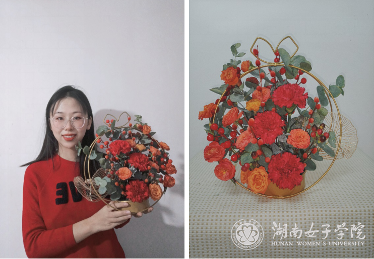 庆贺新春,有“礼”有节。“拜年礼仪是中国传统的风俗习惯,也是辞旧迎新、相互表达美好祝愿的一种方式”。2021级航空服务艺术与管理班学生袁源,结合节俗节庆礼仪和日常生活礼仪专业知识向家人和朋友们讲解春节拜年的礼仪要点,引导大家在过年的气氛中感受传统礼仪里体现出的浓浓年味。新春佳节是探亲访友的好时机,2020级家政学2班学生张悦去亲戚家拜年时除了带去美好祝福外,还结合了家政学插花课程的专业知识,选用了红色康乃馨、橙色多头玫、红豆、银柳等花材,制作了插花作品《如意》作为春节礼物,祝福亲戚朋友家庭幸福、万事胜意。