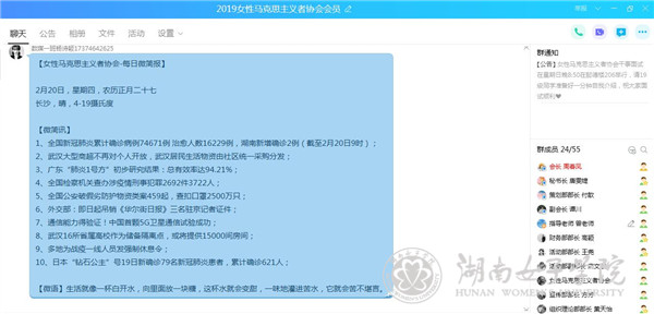 “家里有我,你放心工作。”党员教师颜龙作为最美逆行者背后的男人,让妻子洪雪莲安心到武汉雷神山医院冲锋陷阵,他默默在后方保障家庭,用自己的行动为战疫情服务加油的事迹经红网等官媒报道后,在社会上引起了强烈反响,起到了积极的引导作用。学院其他党员教师纷纷为颜龙老师及妻子的事迹点赞,并表示自己和家人虽然不能到一线去抗击疫情,但绝不为抗击疫情添“乱”,力争用行动备好每一堂思政课。同时,作为学院指导的学生社团——女性马克思主义者协会,在疫情期间也突显了思想宣导、弘扬正能量的组织作用,通过发送每日制作的“微简报”,让社团学生能够及时了解国内外时事动态特别是每天全国抗击疫情情况,使大家真切地感受到了社团的凝聚力和活力。