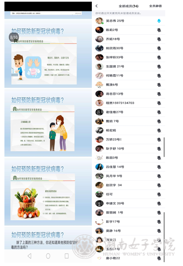 班会由班长主持,在传达学校学院防疫防控精神和要求的同时,号召班上同学积极配合学校学院做好疫情防护防控工作。班上同学就防疫积极发言,各班兼职班主任就班会做发言总结。在班会之后,网上团日活动由团支书主持,进行防疫知识宣传和观看战“疫”视频。我院党总支副书记周思老师也通过网络向广大同学们交流,她号召同学们注意个人和家人安全卫生,注重身心和谐;在家合理规划时间,充分利用假期充实自己,增长才干。