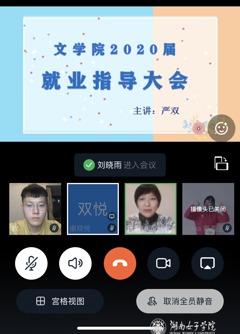本网讯(文学院 谢双悦)为了帮助毕业生更好地了解当前新的就业形势,更深入地了解同学们求职过程中遇到的各种问题与挑战,更精准地做好就业指导与帮扶, 5月15日下午,文学院再次召开2020届毕业生就业指导年级大会。学院党委副书记严双为毕业生带来了一场以“快马扬鞭谋当下,积极进取赢未来”为主题的线上就业指导会。