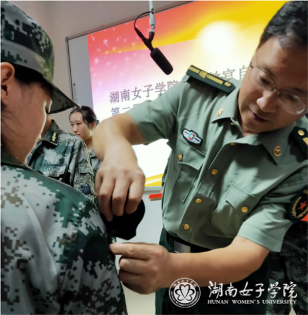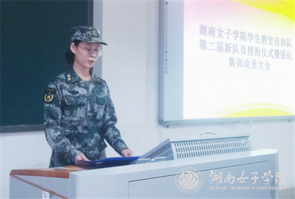 全体队员齐唱《中国人民解放军军歌》,拉开了大会的帷幕。蔡建国宣读《关于任命王恒等66名学生为湖南女子学院学生教官自训队第二届正式队员的决定》。吴长庚,、蔡建国、陈翊、冯咏芬、自训队队长谭文旭、二排排长张莹莹、三排排长张亚娟为第二届新队员授衔。谭文旭带领全体新队员进行入队宣誓。