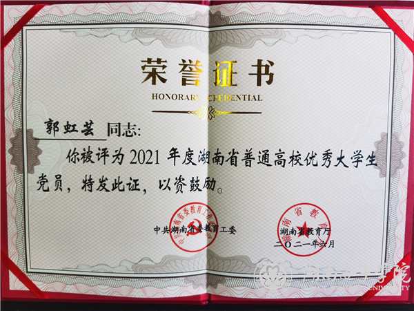 郭虹芸同志严格以共产党员标准要求自己,政治立场坚定,学习成绩优异,积极参加社会实践活动,热心公益,在学习、工作、生活等各方面砥砺意志品质,锤炼品德修为,让自己的青春在奋勇拼搏中绽放光彩。